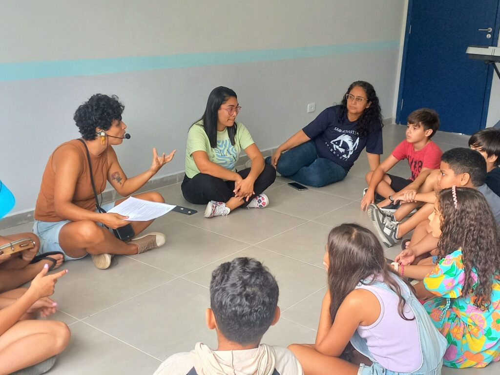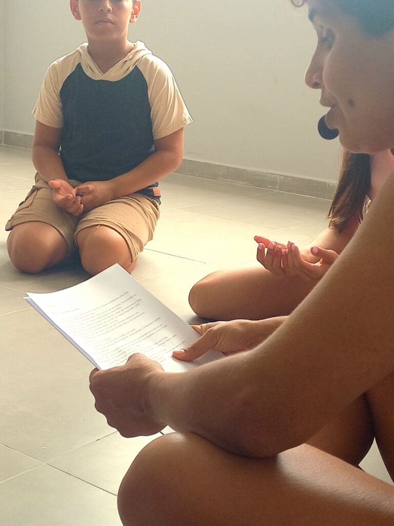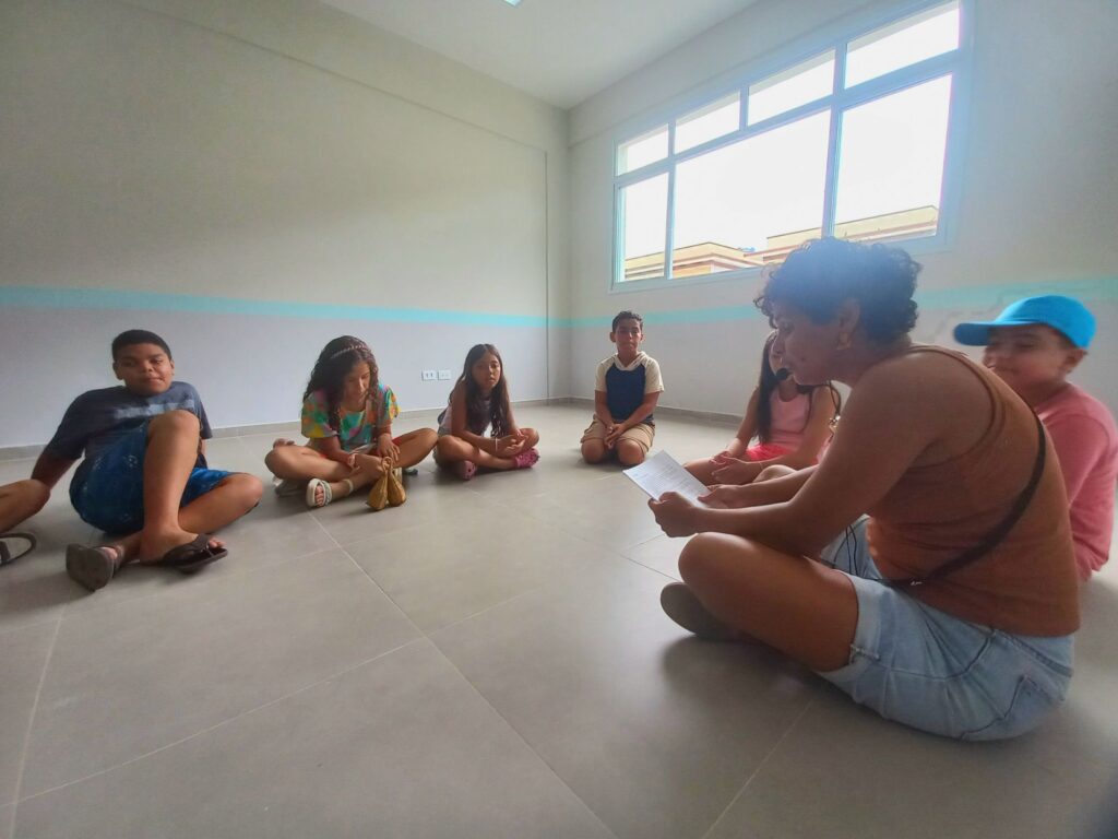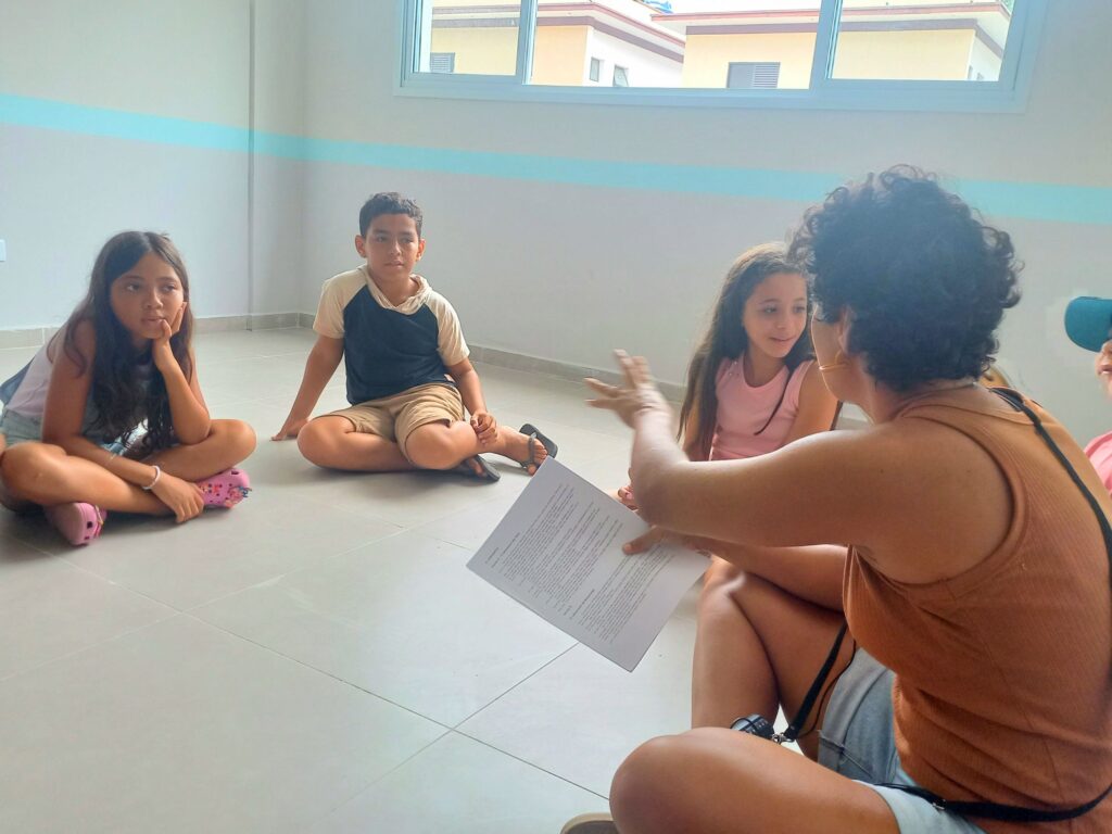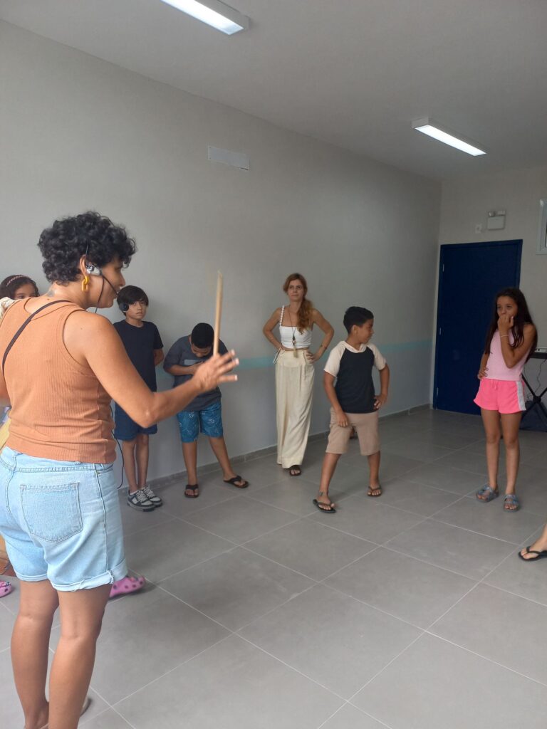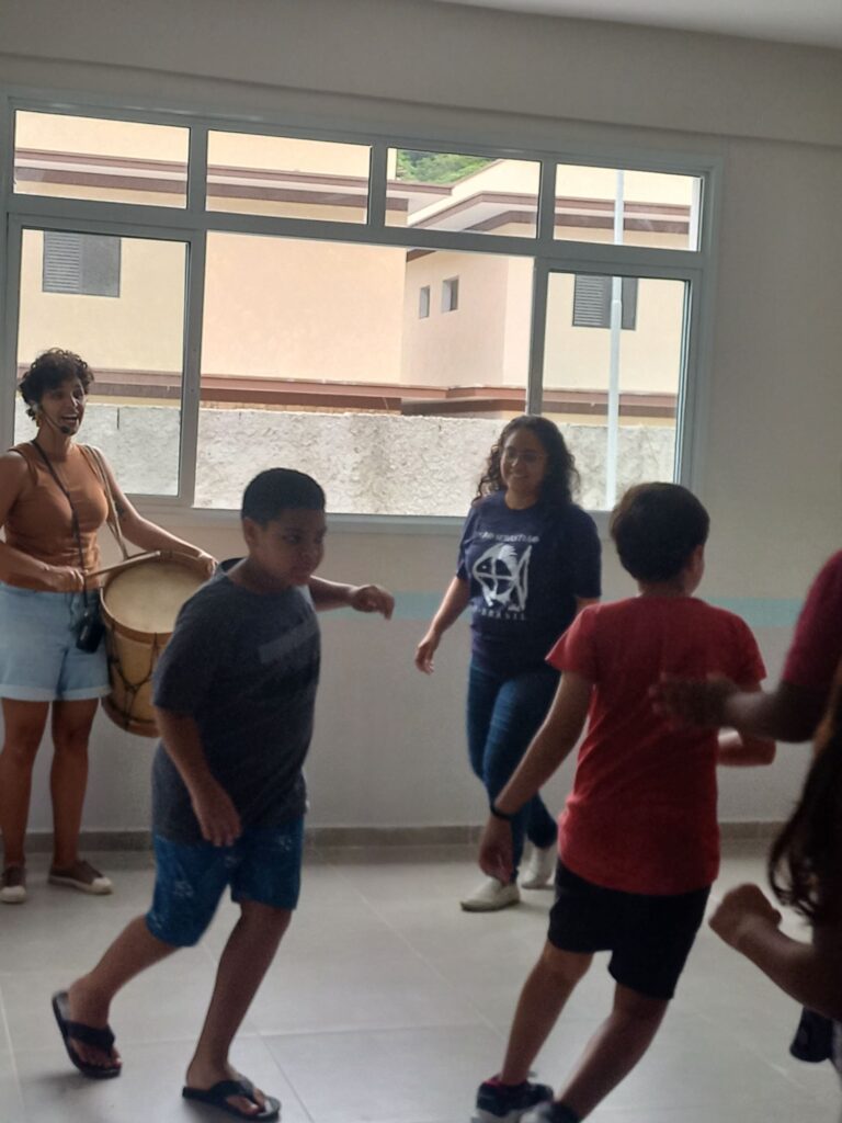 A oficina começou com a professora fazendo uma roda com todos os presentes e contou duas lendas antigas sobre lobisomens caiçara, logo após, ela pediu para que todos ficassem de pé, pegando um tambor e pedia para que a gente desse um passo a cada batuque, ela alternava entre ir com batuques mais rápidos ou mais lentos, isso estava deixando as crianças bem agitadas e envolvidas, e logo após, ela pediu que formassemos uma roda para cantarmos uma cantiga, e todo mundo estava participando dançando e se divertindo muito.