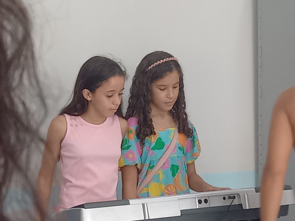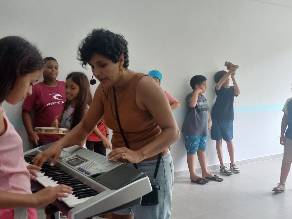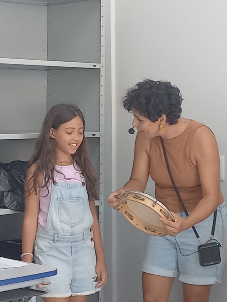 pandeiro, tambor, chocalhos e um teclado,as crianças estavam bem animadas cada uma pode se divertir usando um instrumento diferente, depois de terminar, a entrevistadora Sarah entrevistou uma das crianças.